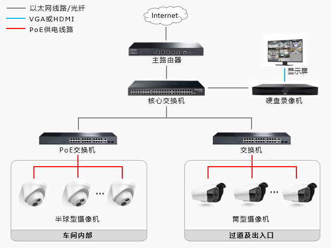 如上图,PoE交换机通过网线为PoE摄像机供电,可以避免额外布线。如果网络中已有无线路由器和普通交换机,可以选择直流供电的IPC。方案采用NVR(硬盘录像机)集中管理所有摄像机。