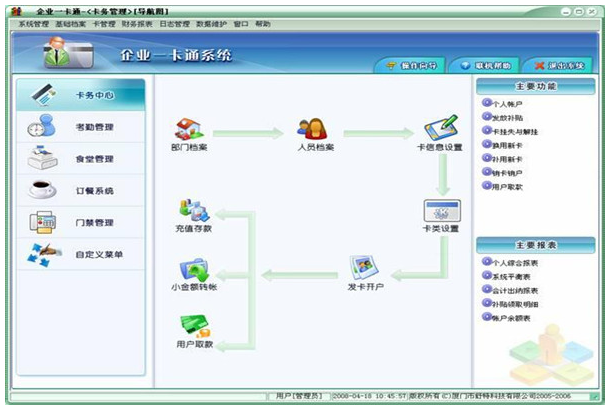 3. 消费系统:在单位食堂内进行就餐管理,具有电子钱包功能。消费者预先给持卡账户充值,在消费时,可使用卡代替现金付款,基本实现无现金流动,规范收费管理。